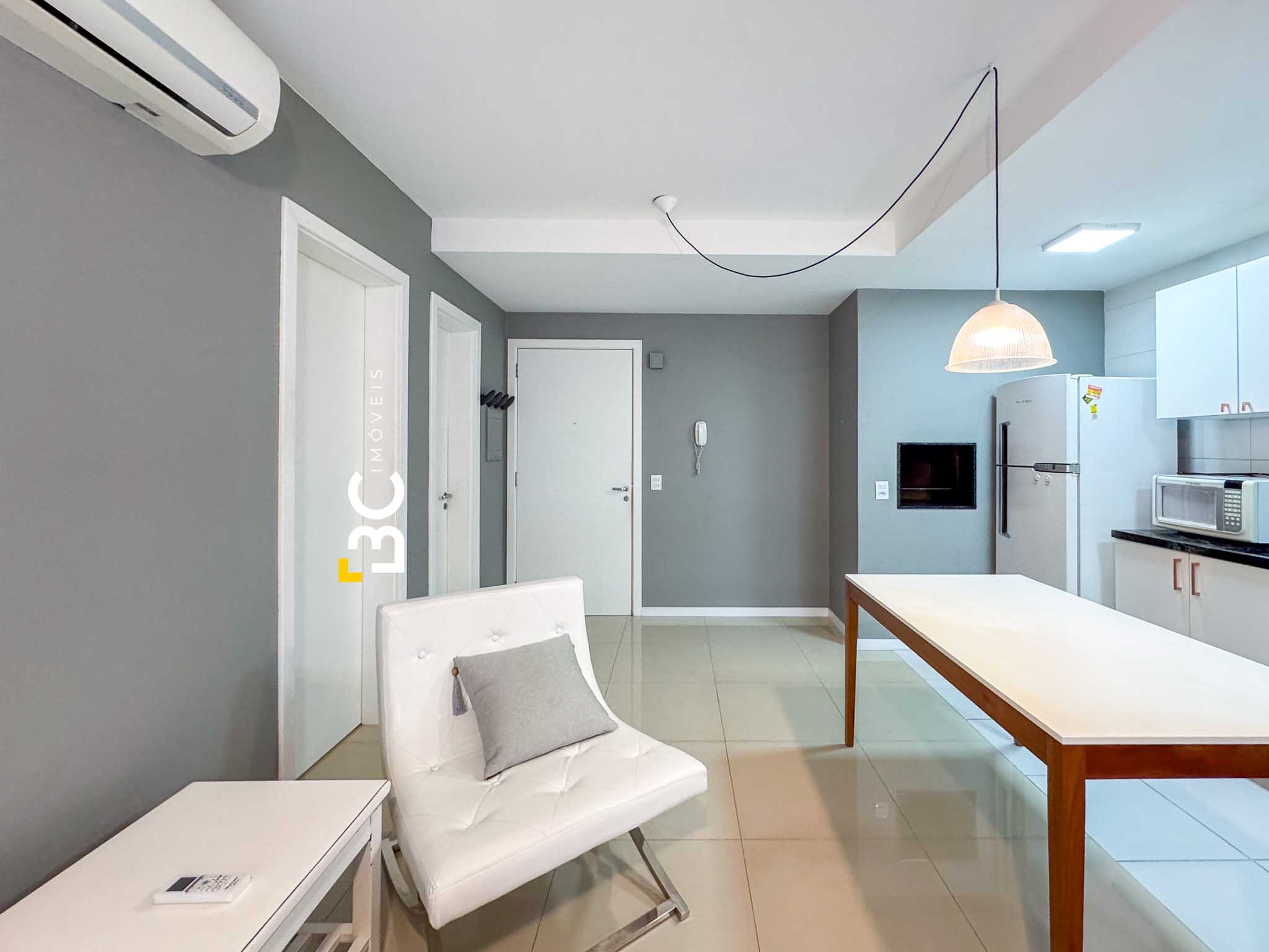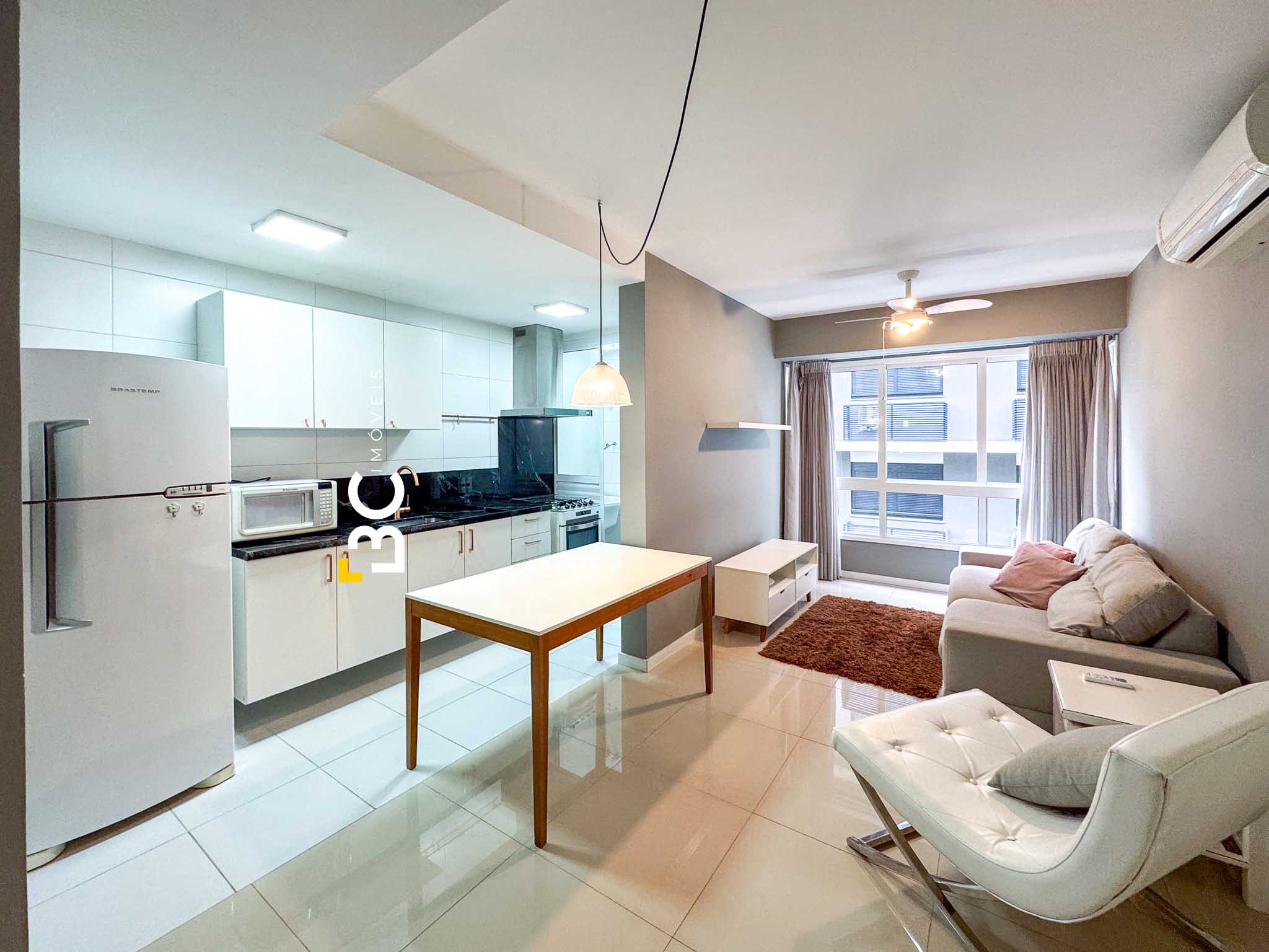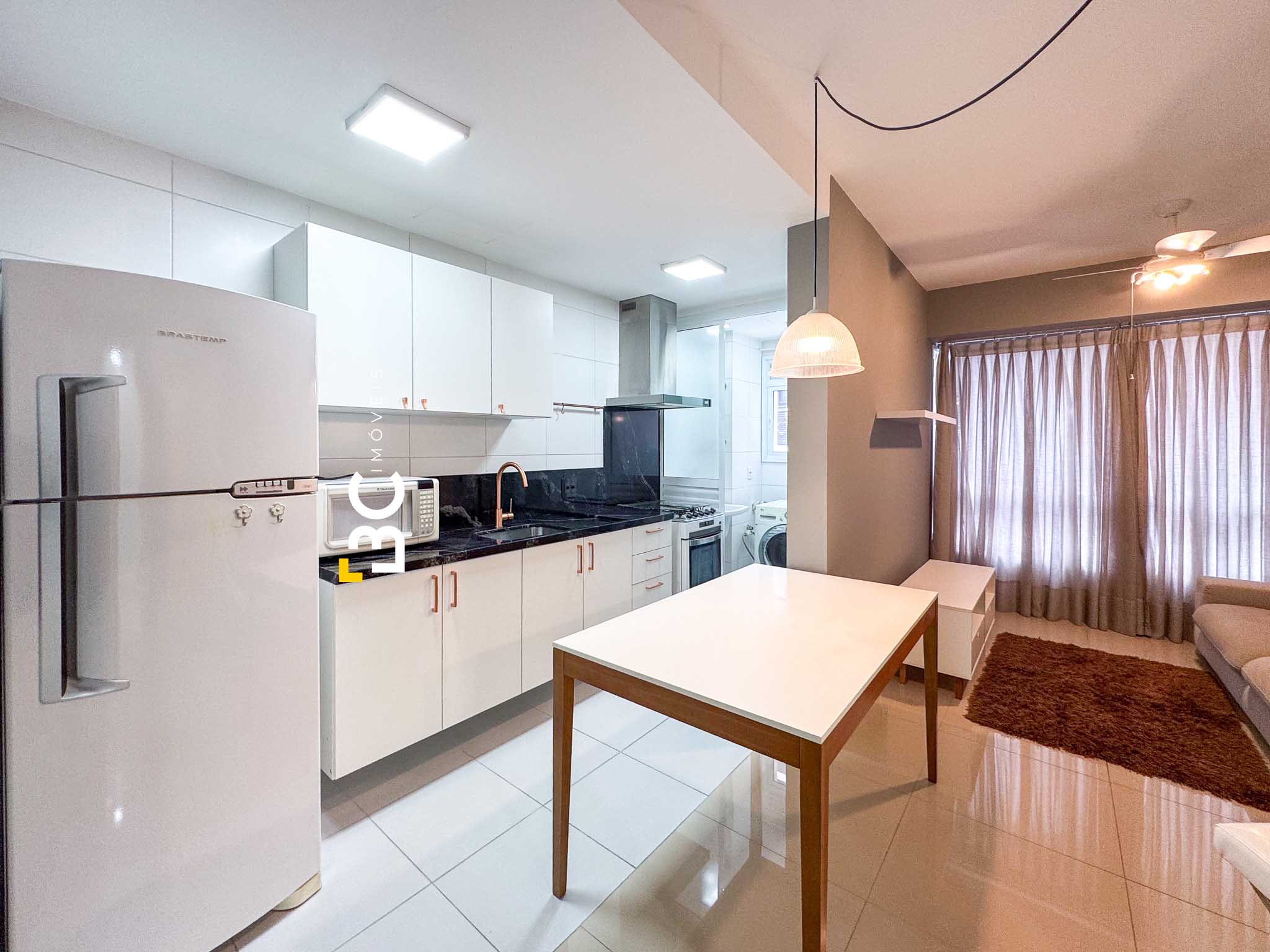 O imóvel possui 44 m² de área privativa e oferece ambiente aconchegante, com 1 dormitório com ar-condicionado, 1 banheiro, living para 2 ambientes (com ar-condicionado), cozinha americana com churrasqueira, área de serviço separada com máquina de lavar – lava e seca. Sua posição frente/lateral, com orientação solar norte/oeste, garante ótima iluminação natural e ventilação.